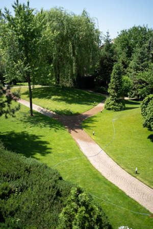 Cozy well-groomed park or garden with plants and flowers in Prague in the Czech Republic