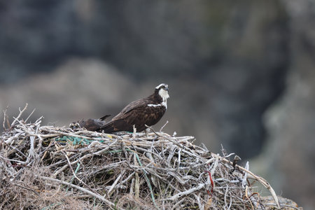 Osprey (Pandion haliaetus) young bird in nest on the coast of Newfoundland Canada