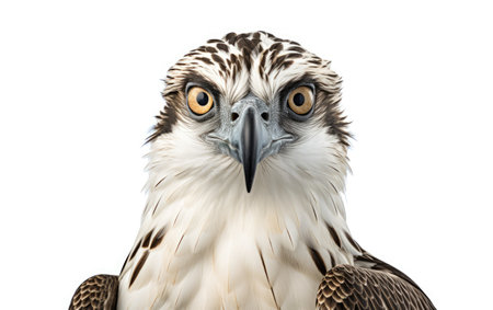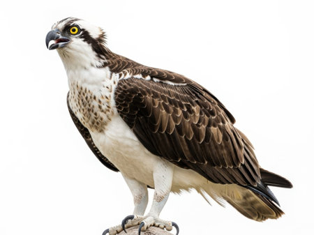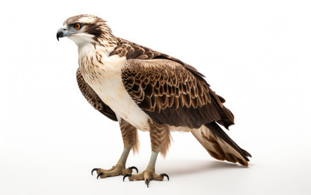 This image features an osprey, a bird of prey known for its distinctive brown and white plumage, isolated against a white background. The bird is perched with its wings folded, showcasing its sharp talons and piercing yellow eyes.