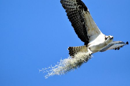 Osprey bird of prey Pandion haliaetus flying across a blue sky over Clam pass in Naples, Florida in the morning.