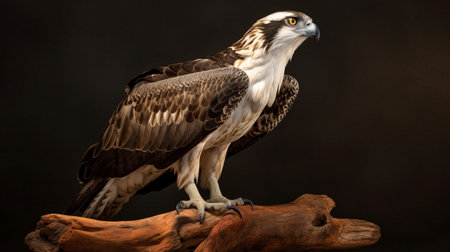 the osprey perches atop a tree, captured in stunning detail with softbox lighting and brushwork mastery. the realistic still life features dramatic lighting, showcasing the bird's dignified pose and strong facial expression. the uhd image is rendered in dark bronze and beige tones, creating a striking and powerful composition. keywords: osprey, tree, realistic still life, dramatic lighting, softbox lighting, brushwork mastery, uhd image, dignified pose,