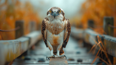 An intense osprey stands alert on a misty pier, with a sharp gaze piercing through a foggy backdrop.