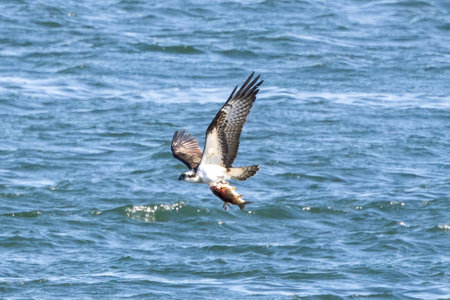 Osprey in flight with a fish in its claws and water in the background