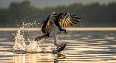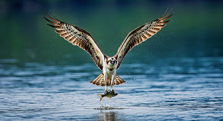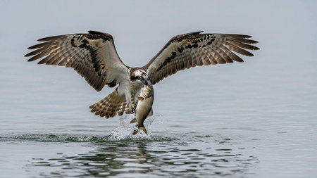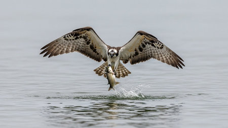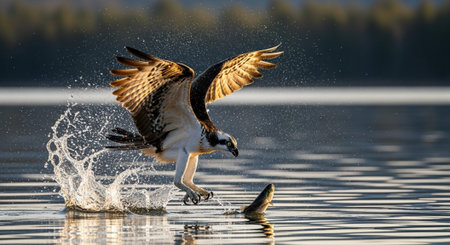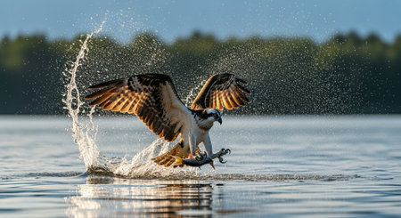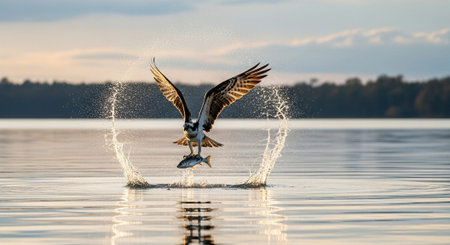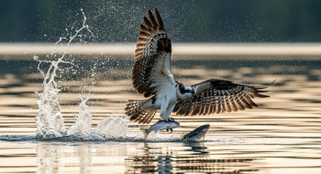A magnificent osprey captures a fish in mid-flight, creating a dynamic splash on the water's surface, showcasing nature's incredible power and beauty.