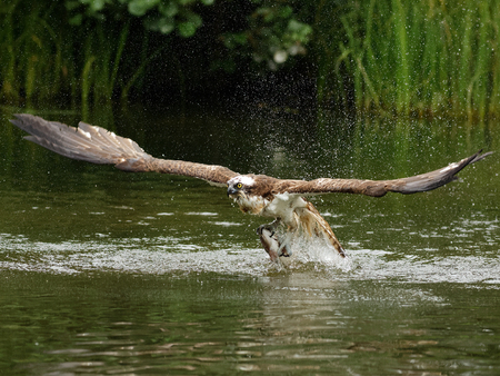 Osprey in flight landing with fish, splashing water, vibrant natural background