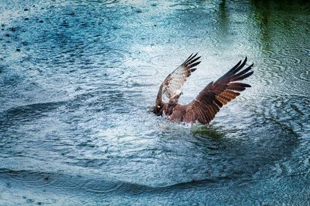 Oprey diving into a lake with spreaded wings to catach a fish