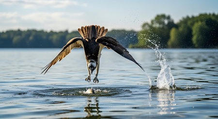 Majestic osprey diving into a lake to catch fish, showcasing its hunting prowess and the beauty of nature