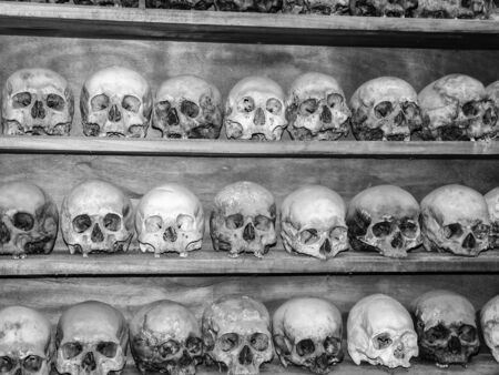 Collection of human skulls - black and white image
