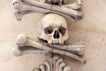Human skulls and bones Kostnice Sedlec Ossuary, small Roman Catholic chapel, Cemetery Church of All Saints in Sedlec, a suburb of Kutna Hora in the Czech Republic. UNESCO world heritage site
