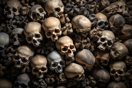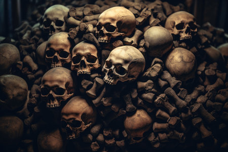 An eerie image of multiple skulls stacked on top of each other, creating a haunting and spine-chilling sight., Pile of human skulls and bones, AI Generated