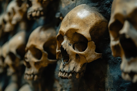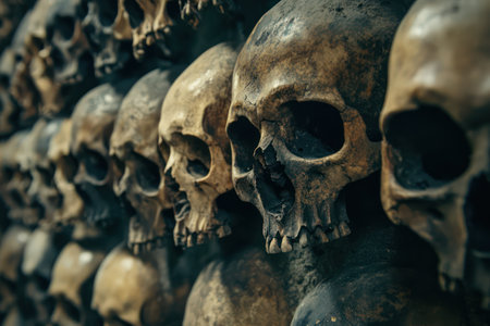Rows of weathered skulls are positioned closely together within a shadowy burial chamber, highlighting the remnants of human history and lost cultures.. Details matter.