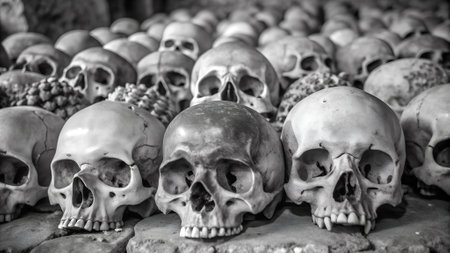 A close-up image showcasing a pile of skulls sitting tightly next to each other., Pile of human skulls and bones, AI Generated