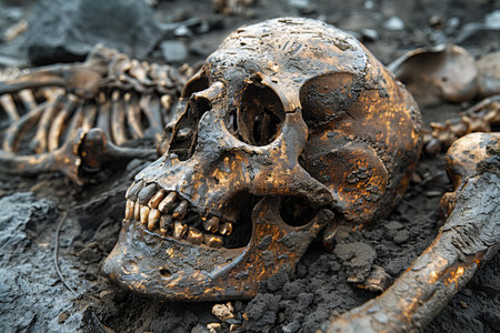 Unearthed skulls lie among dark soil, telling stories of past lives in an eerie setting.
