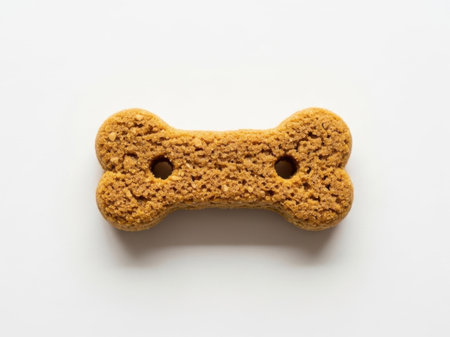 A close-up image of a single bone-shaped dog treat placed on a plain, light-colored background.