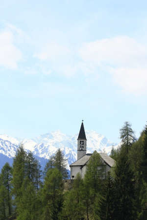 Several houses among the mountains in the early morning. You can see the lid of the church. There is snow in the mountains, the sun is shining.