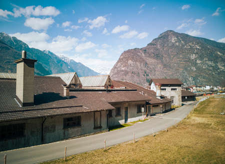 Abandoned factory front view in the valley. Glimpse of Biasca in Switzerland. Nobody inside