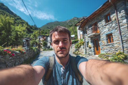 A man enjoys a sunny day while taking a selfie in a picturesque mountain village. Stone houses and lush green hills add charm to this vibrant scene.