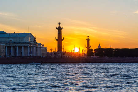 Russia, St. Petersburg, June 2021: View of the Arrow of Vasilievsky Island from the Neva River. Rostral columns at sunset.