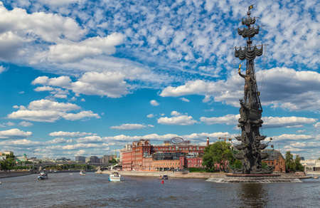 Moscow, Russia - June 24, 2019: Moscow river and Peter the Great Statue. The Peter the Great Statue is a monument, located at the western confluence of the Moskva River and the Vodootvodny Canal in central Moscow.