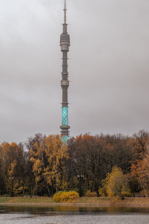 Ostankino TV tower evening view Moscow filmed 11/11/2023 in late autumn