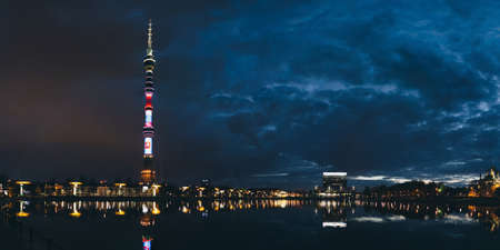 Night TV tower Ostankino, panorama with copy space