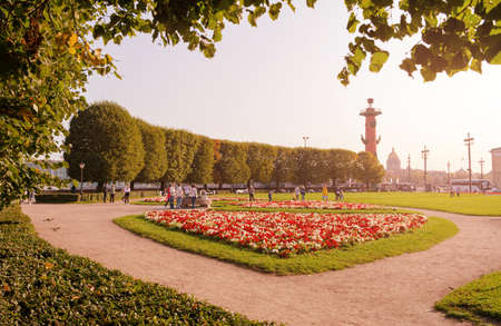 flowers, trees on Vasilievsky Island, rostral column on a sunny day, St. Petersburg, September 2020, editorial