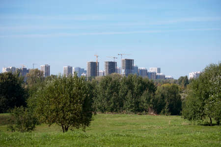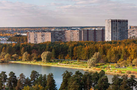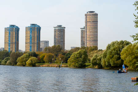 Houses in Strogino on the background of the river, Moscow. The concept of travel and recreation.