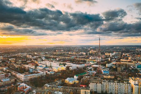 Gomel, Belarus. Aerial View Of Homiel Cityscape Skyline In Autumn Evening. Residential District During Sunset. Birds-eye View