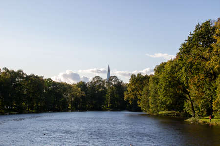 October 30, 2021, Russia, St. Petersburg: Peter and Paul Cathedral on the background of the lake and birch