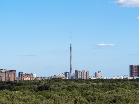 green forest and residential district with TV tower in Moscow city in sunny summer day