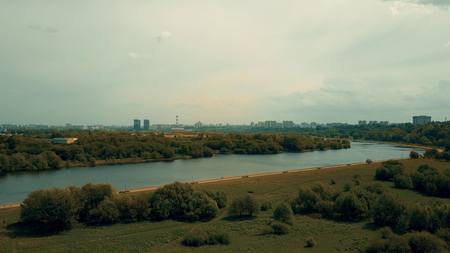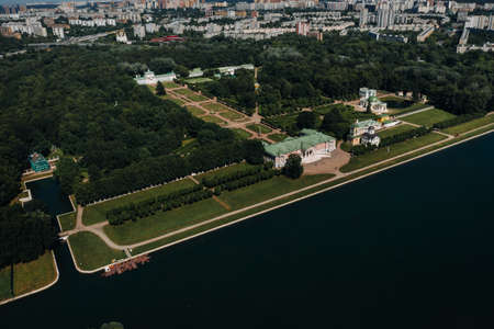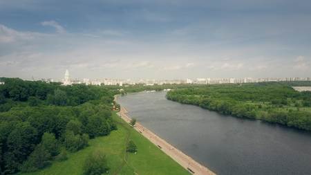 Aerial shot of the Moscow river and Kolomenskoe park embankment