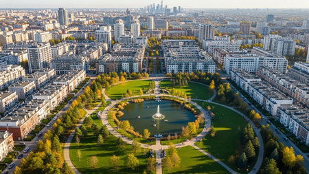 Aerial perspective of a modern urban residential complex with a central park, pond, fountain, and surrounding autumn...