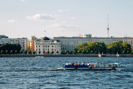 Petrogradsky District riverside street with Neva river in Saint Petersburg, Russia