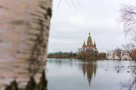 Russian cathedral next to the lake in autumn day