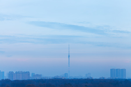 twilight blue sky over city with TV tower in winter evening