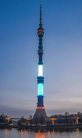 Moscow, Russia - October 2021: Ostankino TV tower and a beautiful sunset.