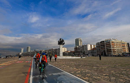 (Gündogdu square - Izmir - Turkey January 22, 2021) Cyclists doing sports on the alsancak bicycle path, one of the most famous areas of Izmir.