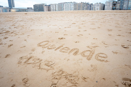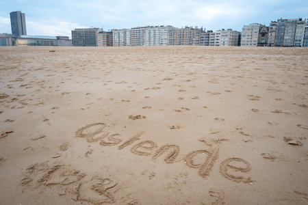 Ostend exclamation word on sea sand. Belgium. Houses, hotel and beautiful walking way.
