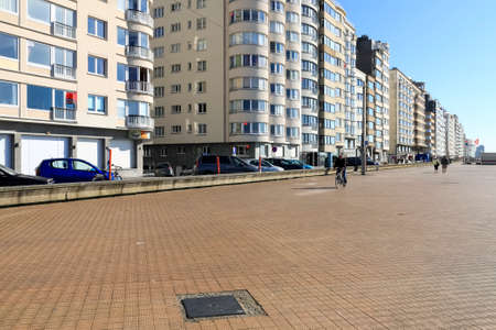 Ostend, Belgium - June 02, 2010: Large apartment buildings overlooking the wide promenade and the sea, which can not be seen here but it is behind the promenade. There are very few people.