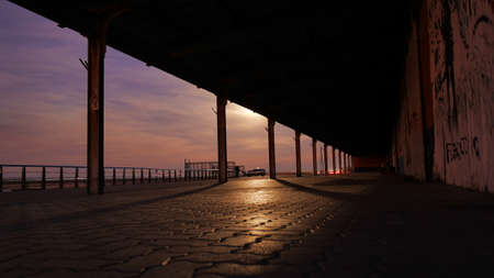 Beautiful sunset at the sea in the Belgian city of Ostend. Embankment and houses in the rays of the setting sun. Romantic mood.