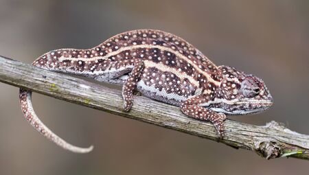 A beautiful chameleon sits on a tree branch. Merges with nature