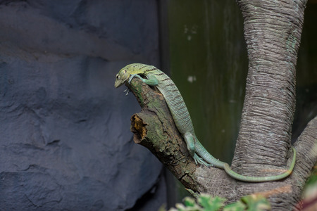 The collared iguana - Crotaphytus collaris - crawls on the trunk. A small lizard with a long tail.