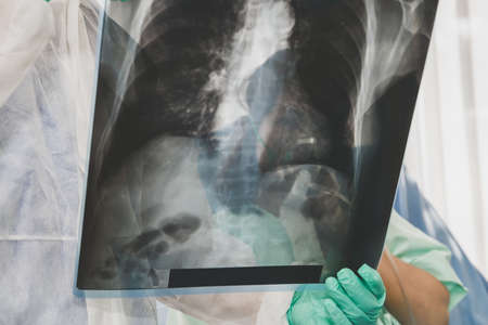 Caring for patients with the flu Covid-19 : Radiologist holds a chest X-ray film for the female lung-respiratory patients to look at the symptoms for the patients to understand : Selective Focus