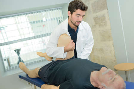 doctor is stretching mans leg on physiotherapy session
