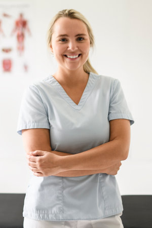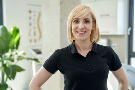 nice blond physiotherapist woman at job