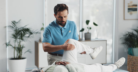 Physiotherapist, man and patient with stretching legs for injury, healing and care for wellness. People, recovery and support with guide, advice and help for knee pain, arthritis for rehabilitation