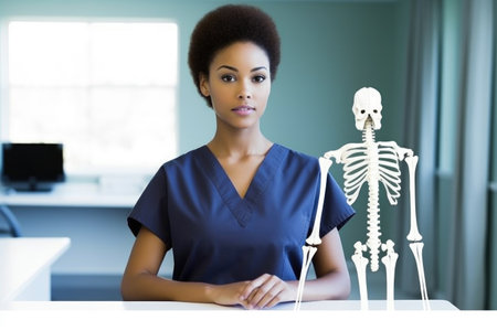 Female therapist in white coat holding spine model and stethoscope in therapy room, copy space. Medical professional, healthcare, anatomy, wellness, rehabilitation, clinical, treatment