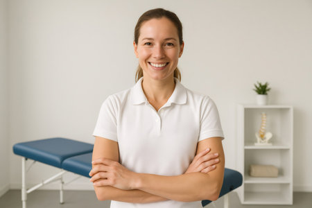 Physiotherapist smiling with arms crossed, standing in her bright office in front of a massage table