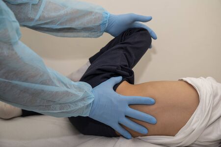 A professional physiotherapist is stretching the patient's legs, the patient has muscle dysfunction due to hard work, most often an office worker who has problems sitting for long periods of time.