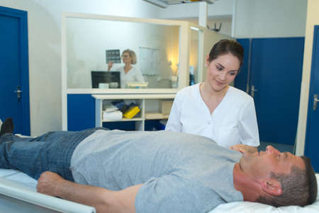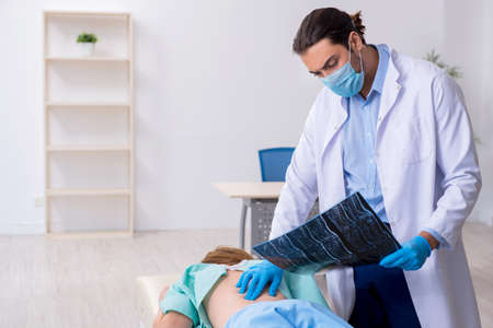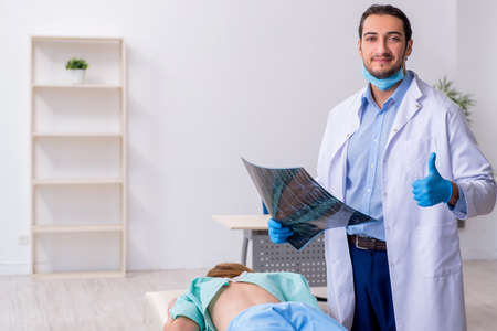 Handsome professional physiotherapist examining the x-rays of the spine of a female patient